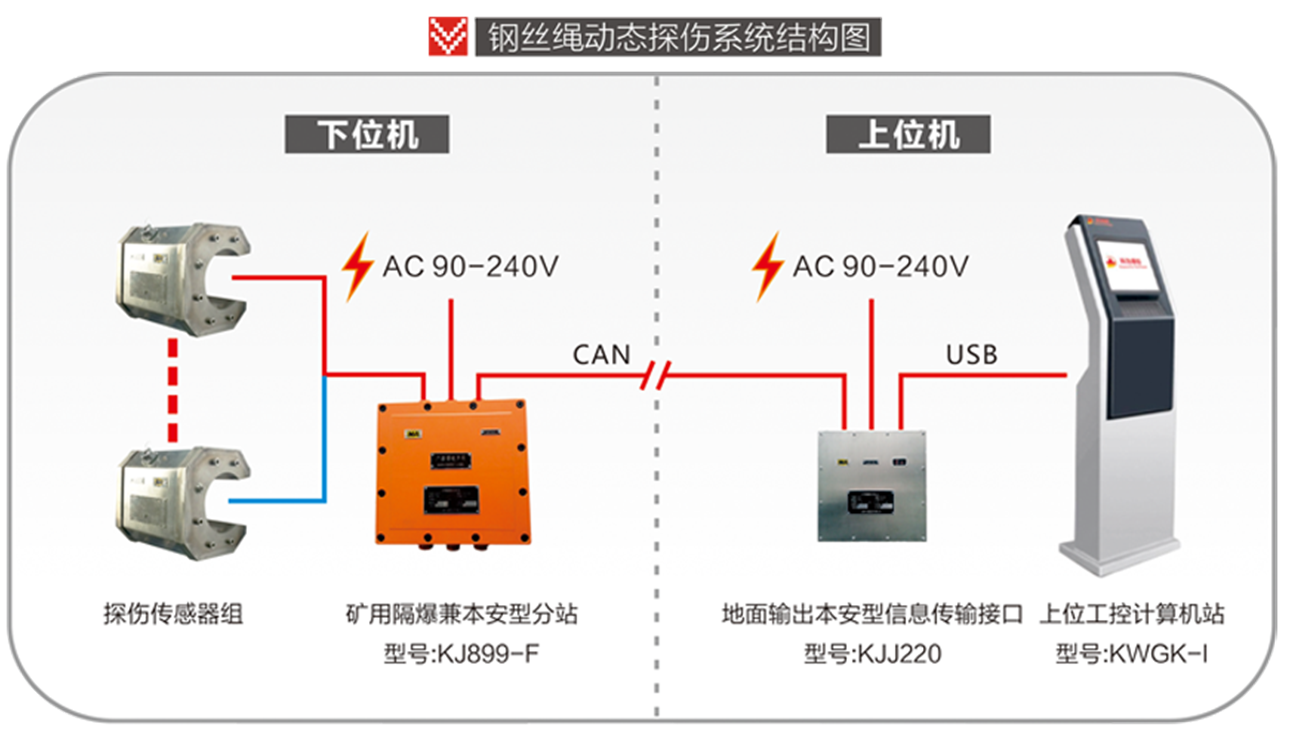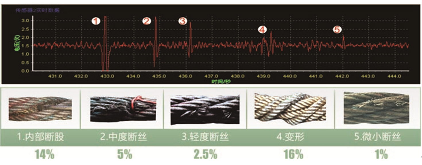 實現對鋼絲繩斷絲、變形、磨損。銹蝕、松股、跳絲等缺陷類型的在線實監控,并準確定位。